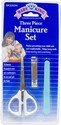 A 3 piece manacure set makes grooming your son or daughter comfortable and safe. Assists in keeping nails from tearing and itching. Includes scissors, nail clippers, as well as an emery board.